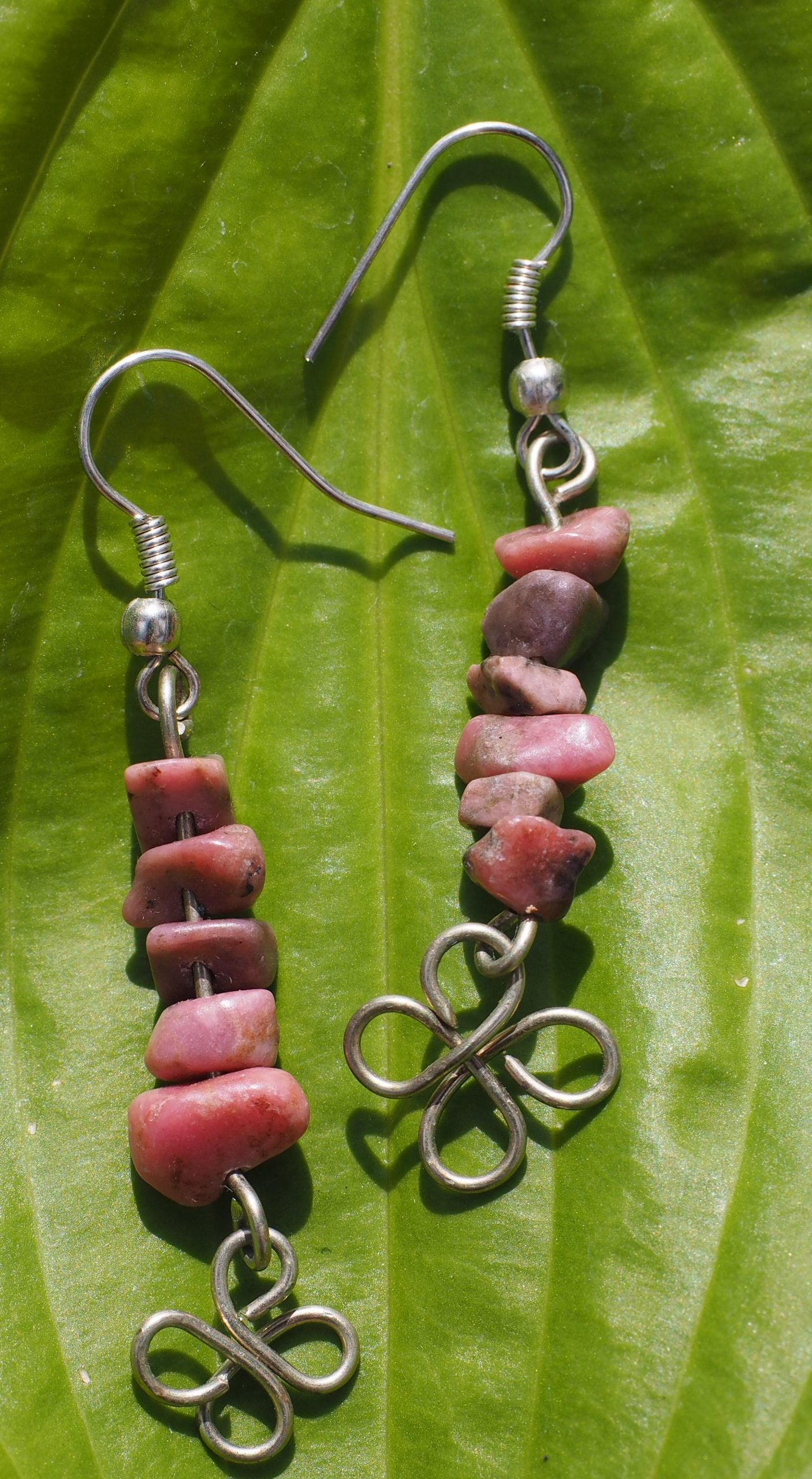 A pair of Goregous Rhodonite semi precious stone earrings with alpaca silver wire flowers.