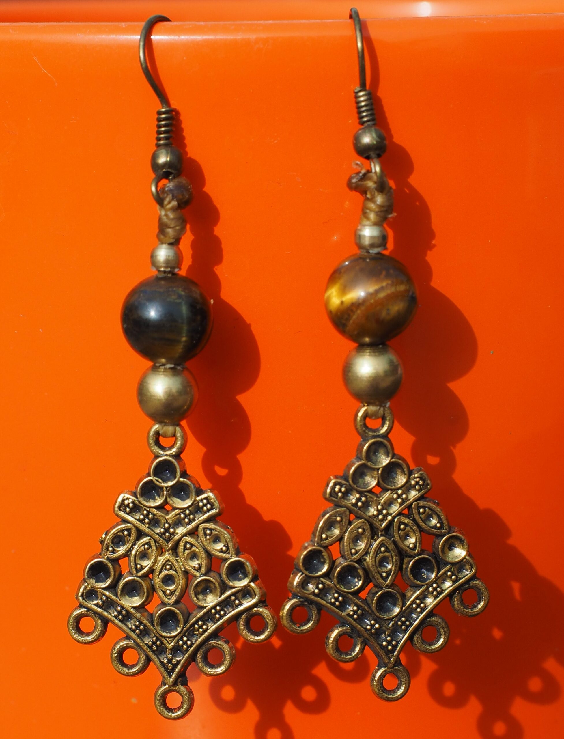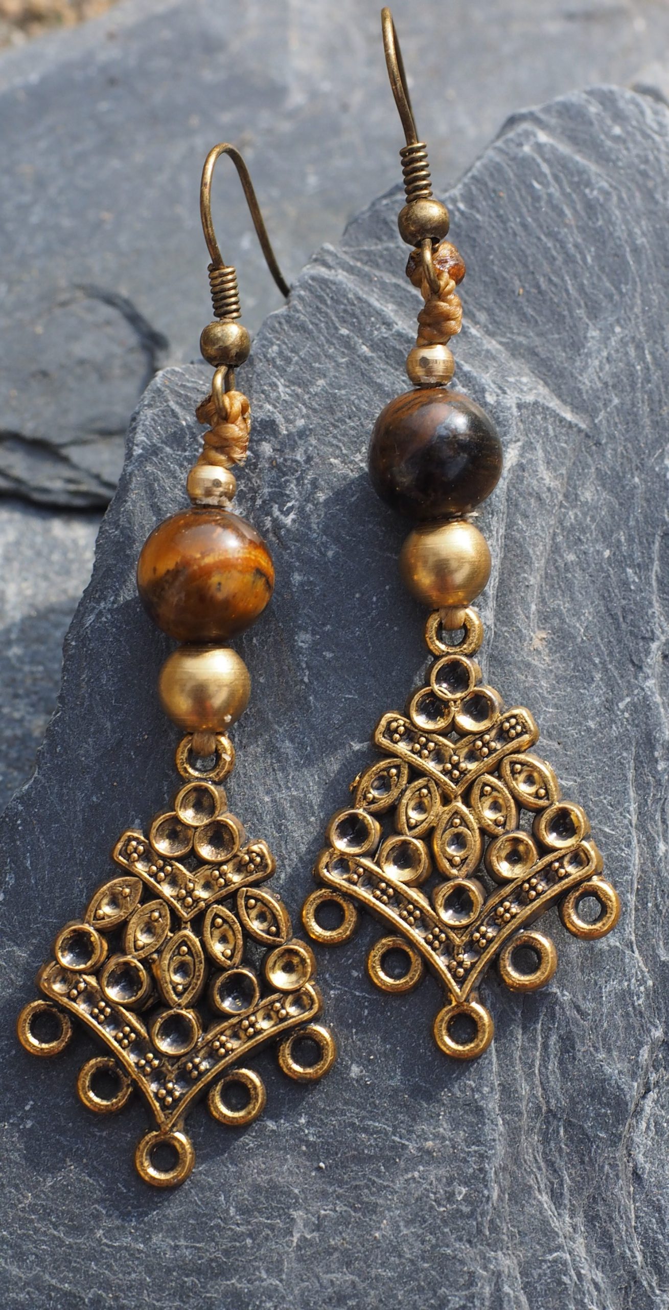 Tribal brass earrings with a tigers eye semi precious stone threaded on durable Linhasita macrame cord.