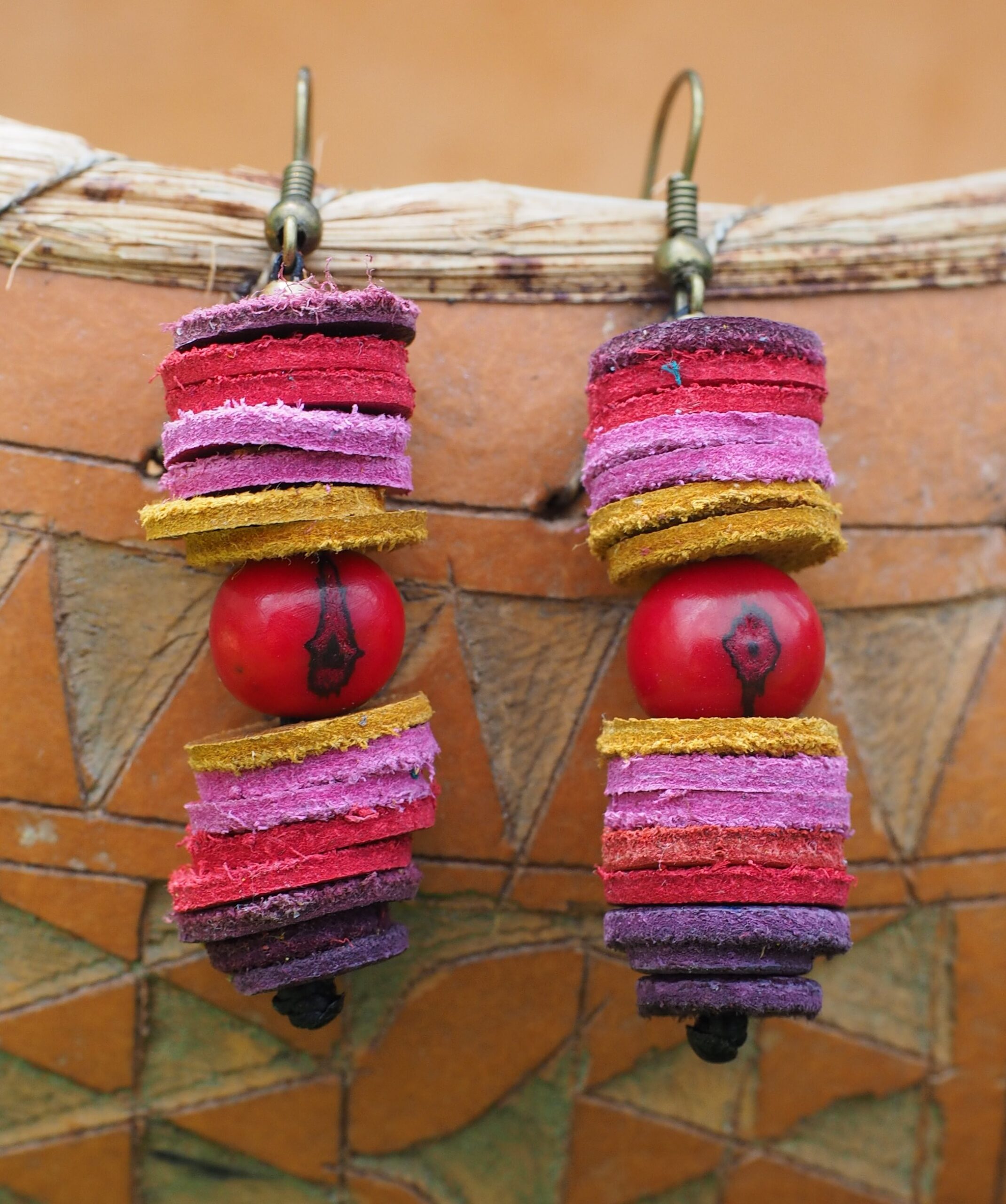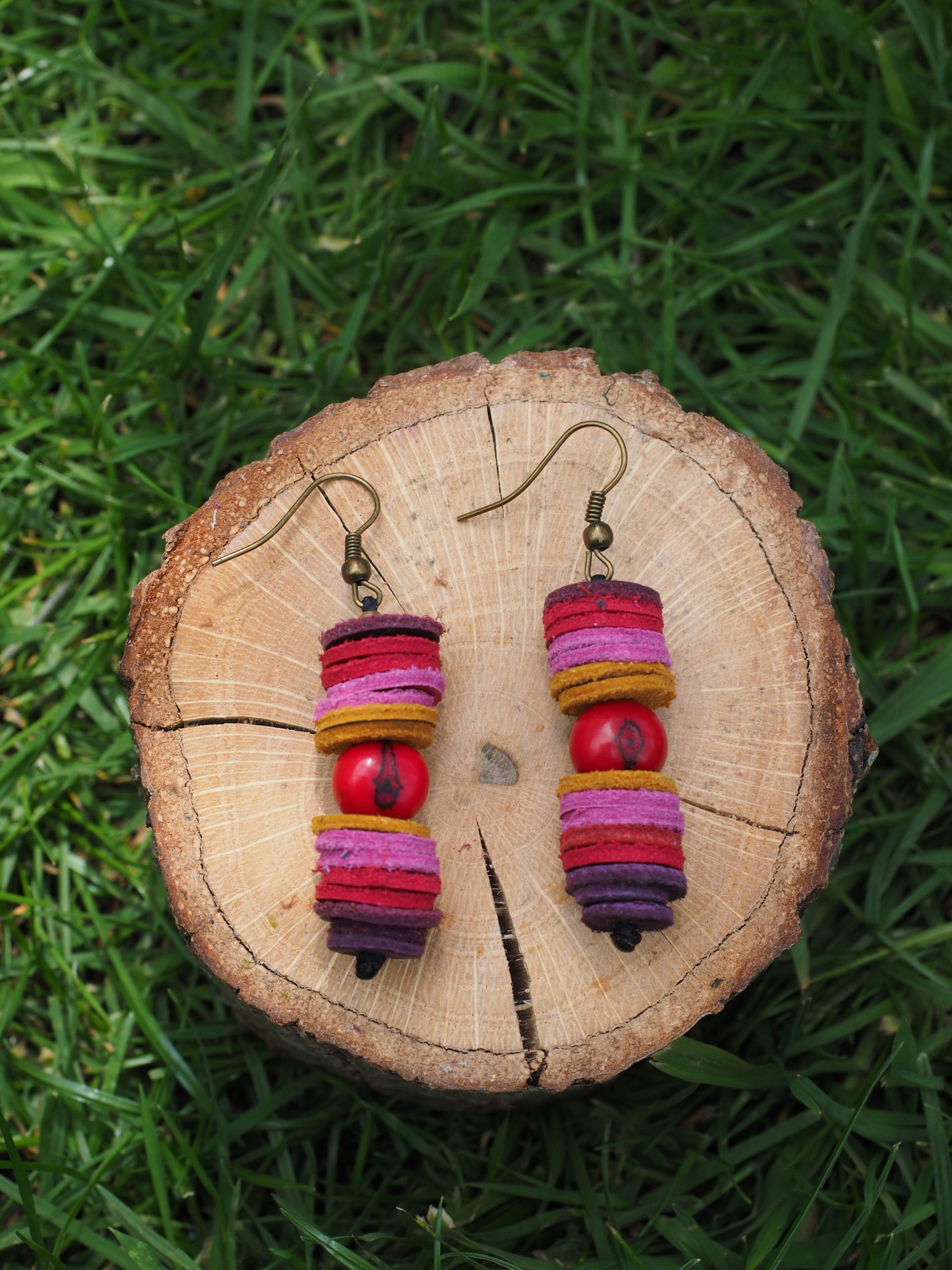 They’re fun and fresh, made from purple,red, pimnk and yellow leather discs with a bright red Acai seed centrepiece from the Colombian Amazon.